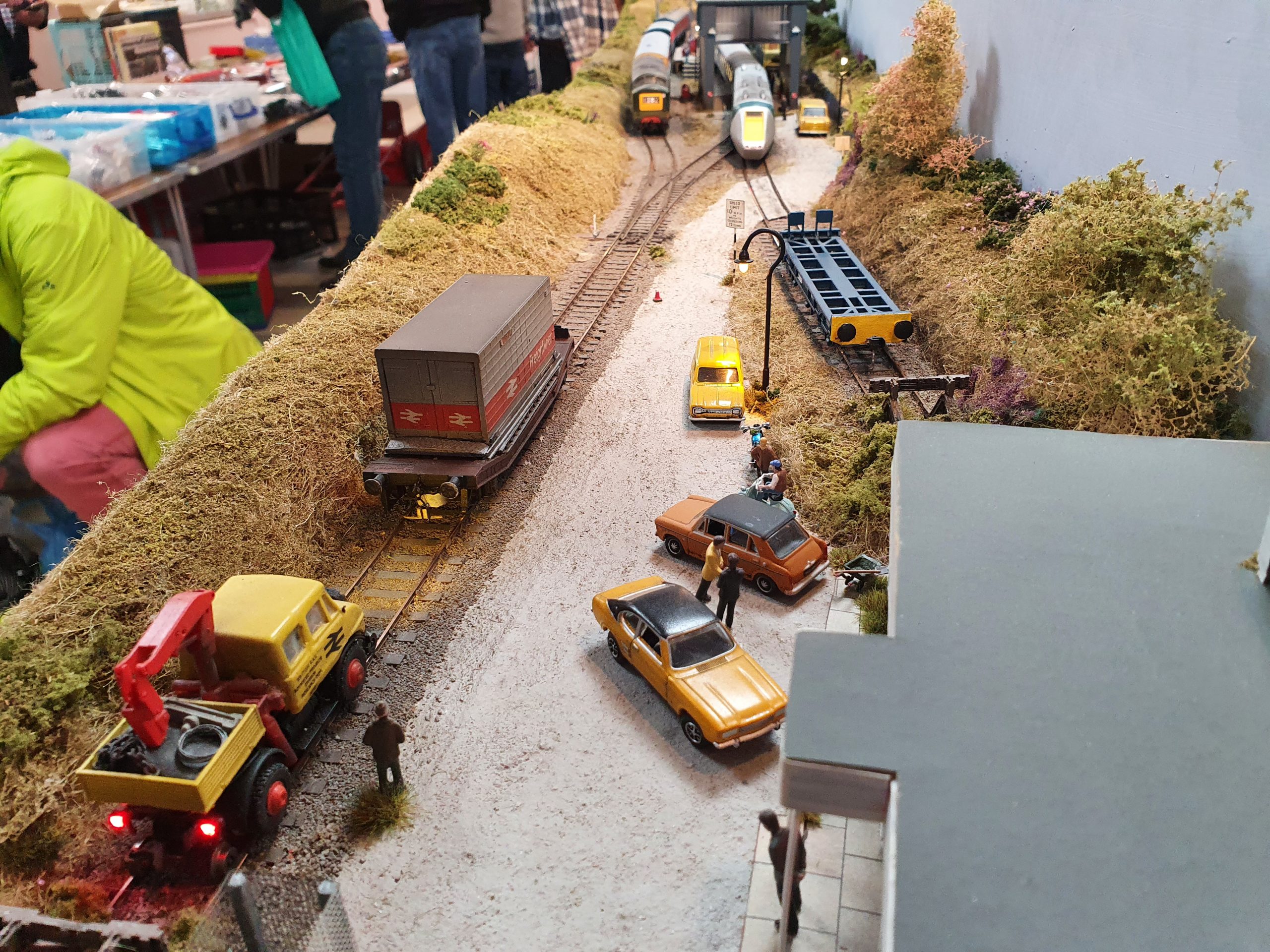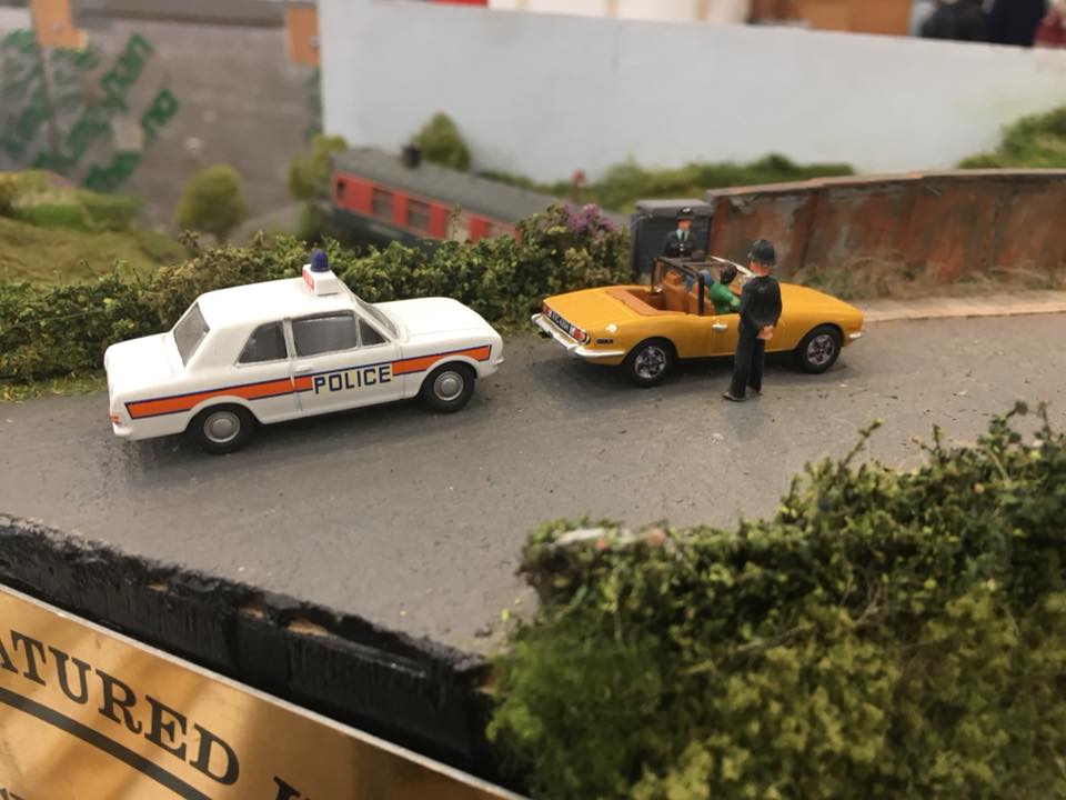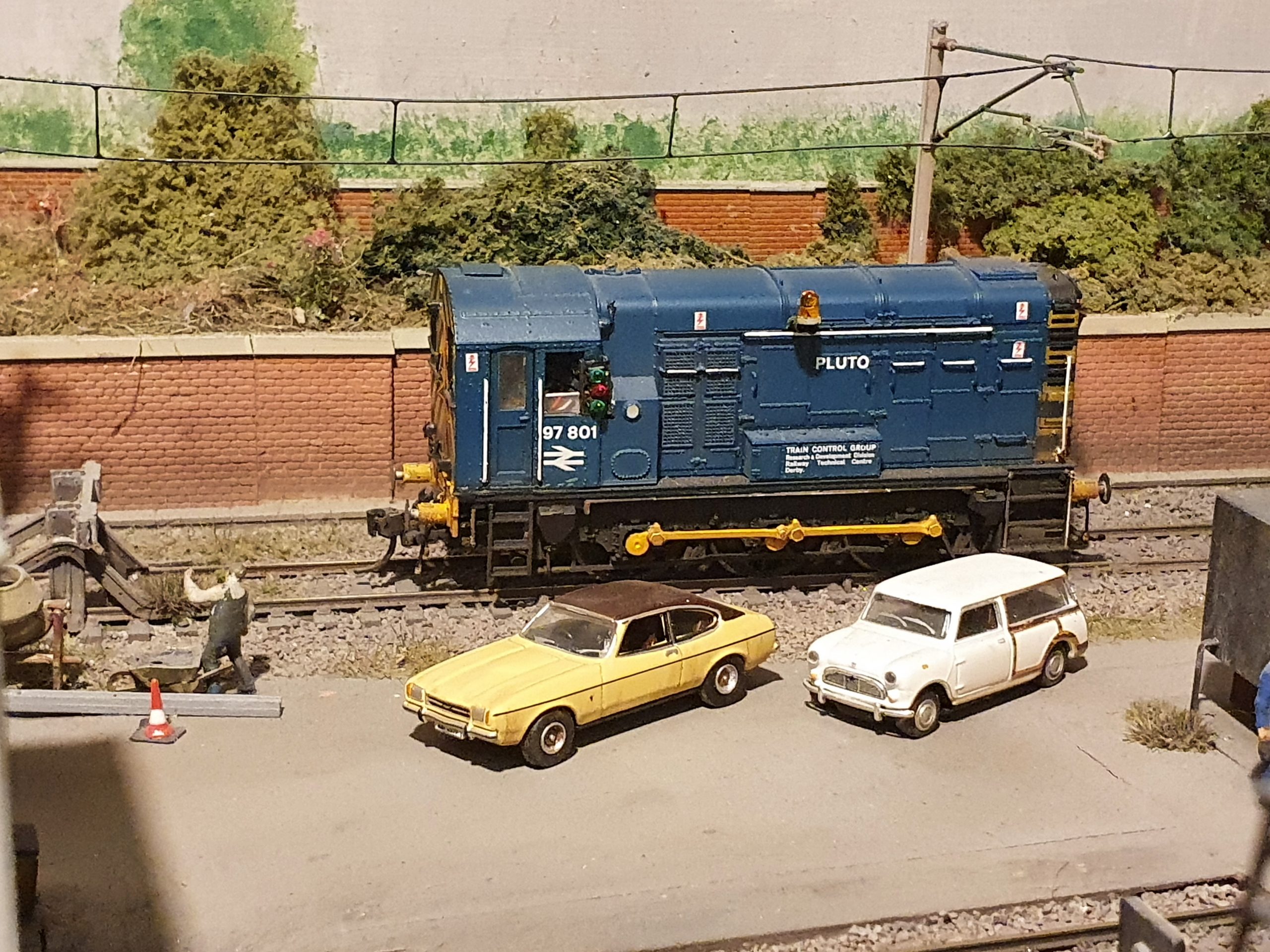Hornby 08 with added flashing beacon and side indicator lights. A classic mini and capri too..!