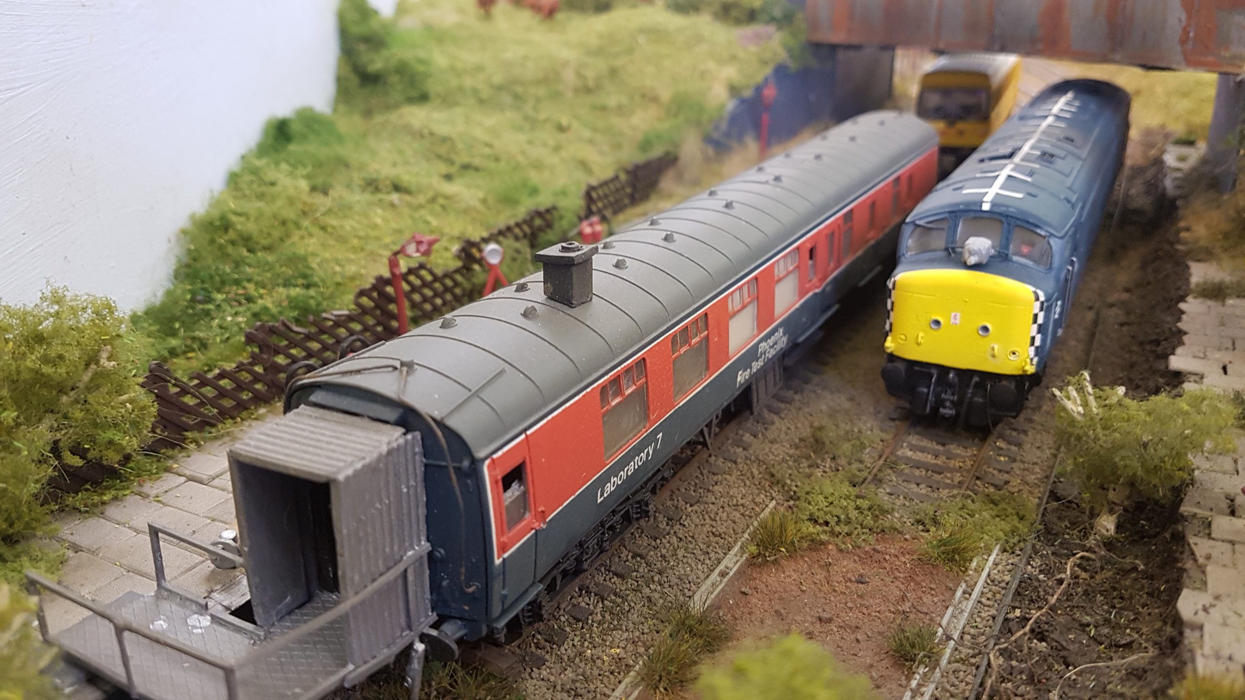 The end of line. 46009 alongside Phoenix Laboratory 7, the fire test coach which occasionally lets out clouds of smoke!